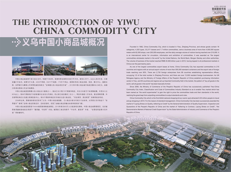 中国小商品城篁园服装市场地处义乌最为繁华的绣湖商圈,市场总占地117亩,总建筑面积42余万平方米,总投资14亿,余2011年4月份投入使用。篁园服装市场定位为专业服装市场,符合市场国际化、品牌化、多元化的发展趋势,有利于提升义乌服装市场的竞争力,推进专业化、规模化发展。 为优化行业布局,强化竞争实力,突出规模优势,凸显市场商机,篁园服装市场1-5楼布局男装.皮装;女装;童装;牛仔.裤;睡衣.羊毛衫.运动服.衬衫共5个经营类别。